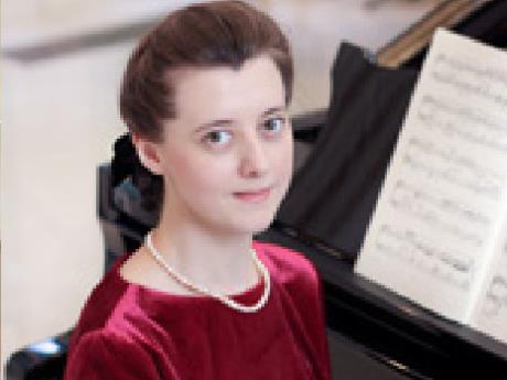 白い壁にアンティークな家具が並んだ、ラグジュアリーな雰囲気のピアノ室。