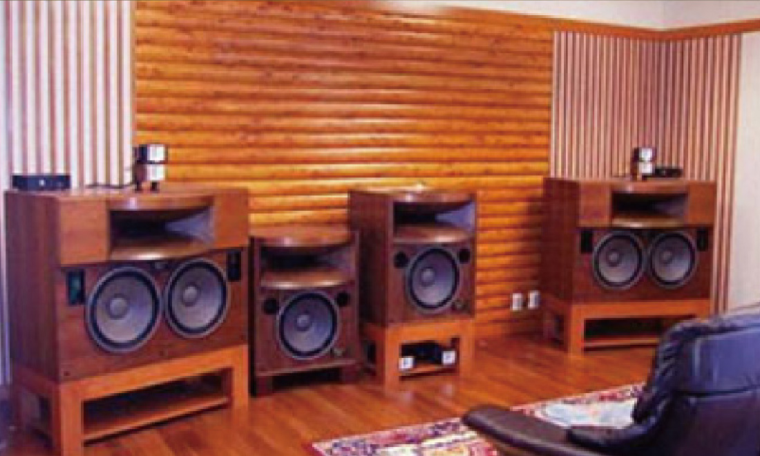 音楽学校・公共施設・スタジオこだわりのオーディオルーム。Y 様邸究極のオーディオルームを目指して、計画に1年以上を費やして完成しました。天井部分には、古木の梁、正面には、天然木による拡散壁、音響設計に基づき計画された拡散形状の壁面、天然素材にこだわった仕上げです。