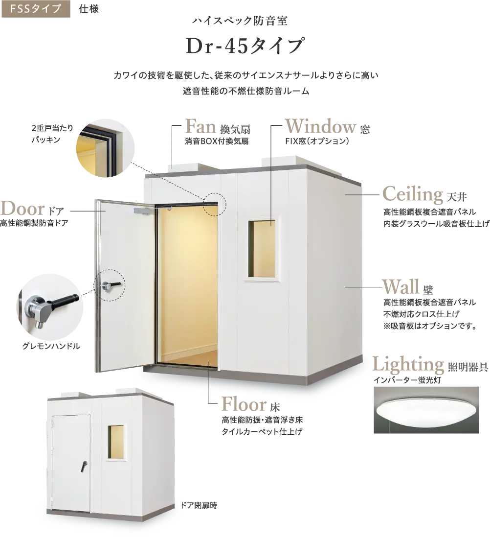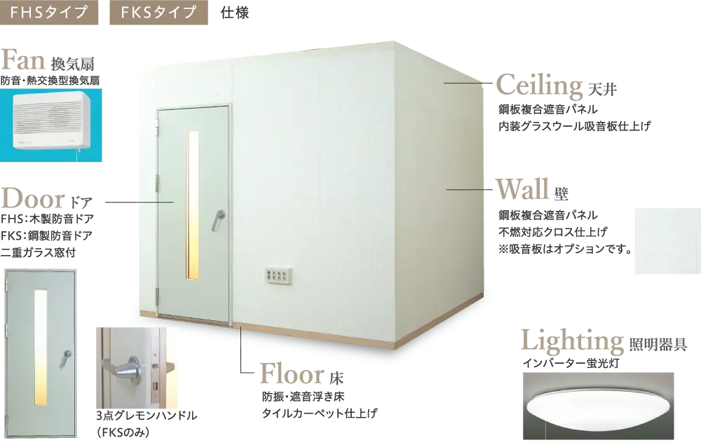 • ●木製防音ドア、二重ガラス窓付き(FHS)