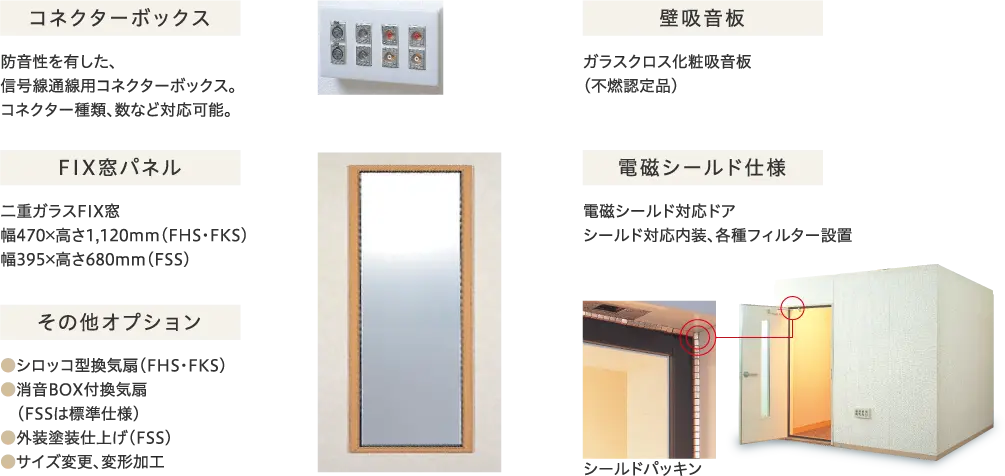 オプションのFIX窓パネル、コネクターボックス、壁吸音板の設置により聴力検査室仕様が可能